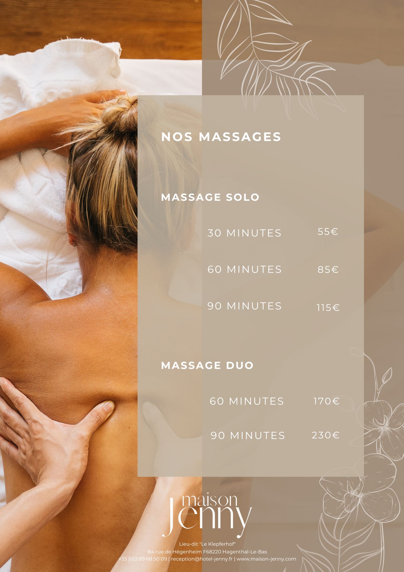 *Pour votre plus grand confort, en hiver les massages ont lieu dans l’une de nos chambres d’hôtel.